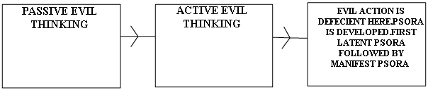 As soon as he exercised the power of free will, with which he was gifted, and willed against the law of nature, the trouble began. Example god willed man to love his neighbour but instead he began to hate his neighbour. Evil thinking caused commotion in mind. Yet , it was evil thinking only, ie this condition of mind was yet a condition of mind only and was not expressed in active desire. But any passive condition of mind is bound to be followed by active condition. The passive hatred gradually developed into actual hatred and then came action. Now, passive thinking even if it is evil is harmless, because in it element to do is deficient, but active thinking in which there is a element of "doing" according to thinking is the beginning of harm. This active thinking ,this mental endeavour of doing ,is a kind of mental itching and this is "psora"
