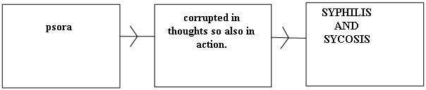 PSORA WAS THE RESULT OF EVIL THINKING, AND SYCOSIS AND SYPHILIS WERE THE RESULTS OF EVIL DOING. It therefore, follows that without psora there could have been no sycosis or syphilis because without thinking there could have been no action. Thus without psora there could have been no disease at all.
